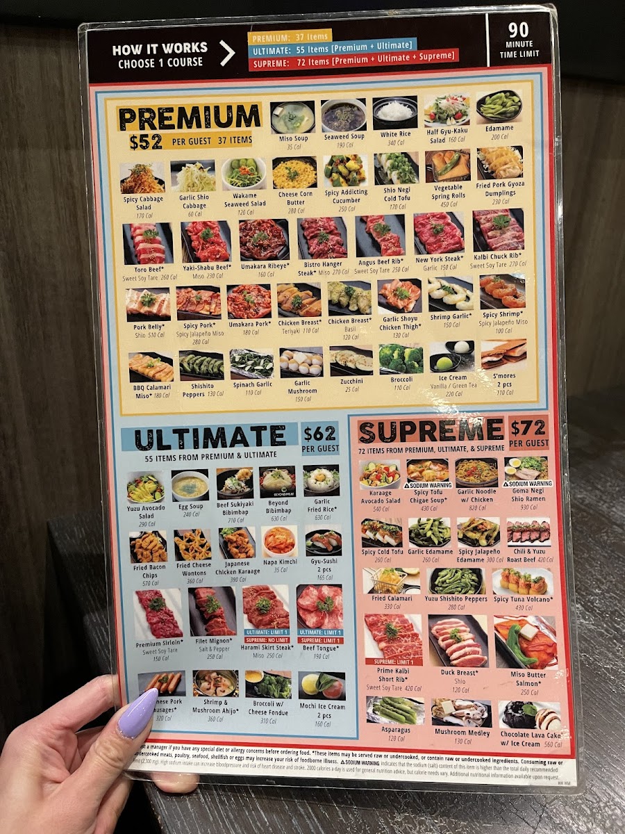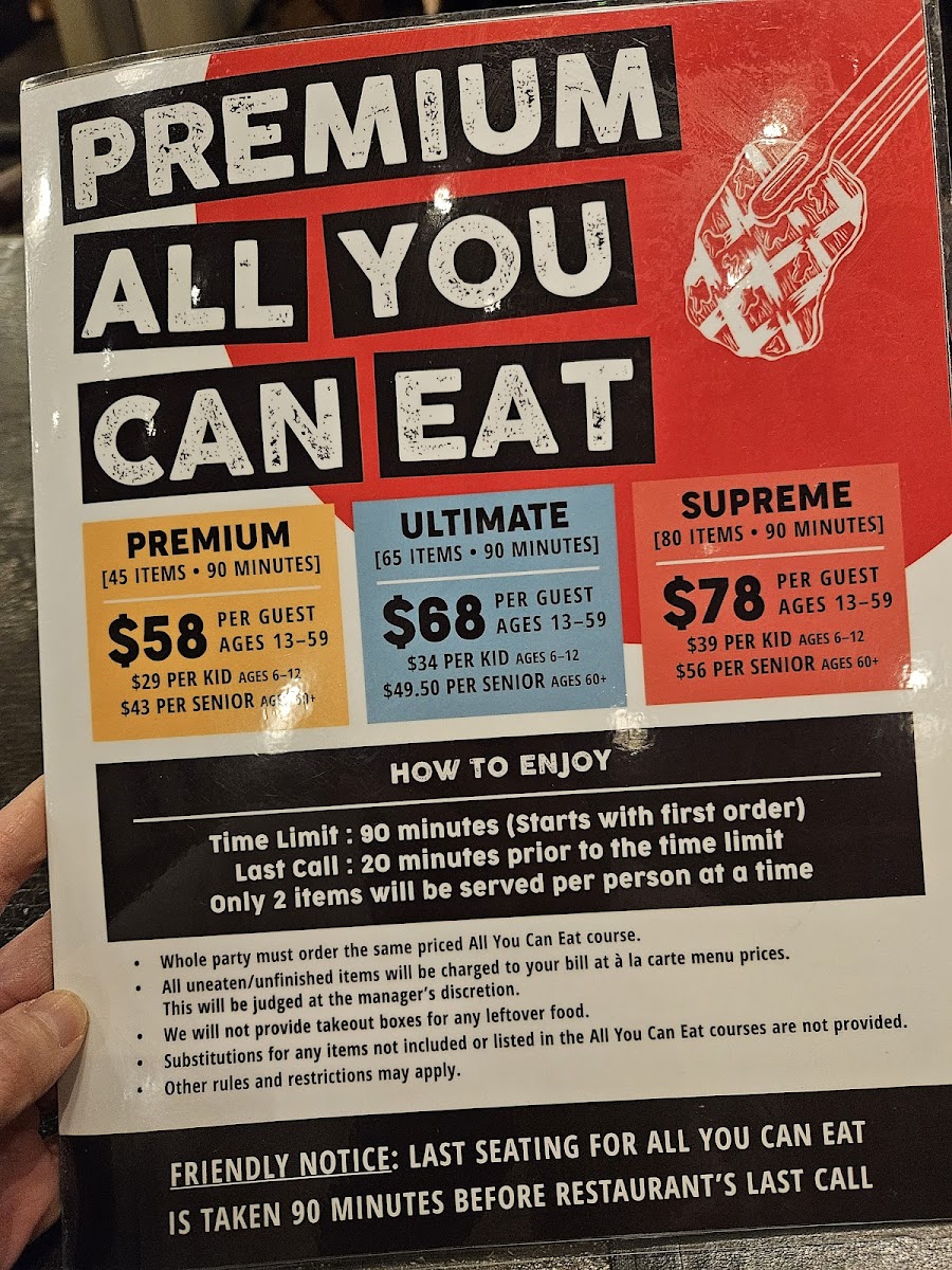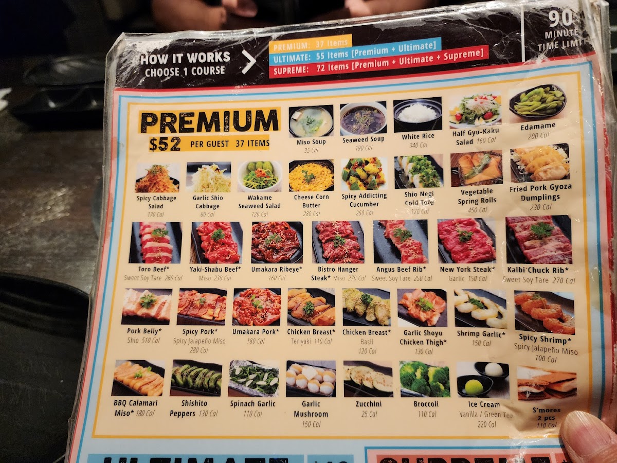 The menu offers a delightful selection of marinated meats that you can cook right at your table. Highlights include the tender filet mignon, flavorful kalbi chuck rib, and the highly recommended beef tongue and harami skirt steak. For those looking to sample multiple dishes, the AYCE Ultimate option features 65 choices!